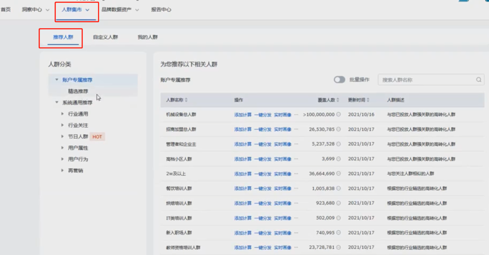 在“人群集市”板块主要有:推荐人群、自定义人群、我的人群三个模块。