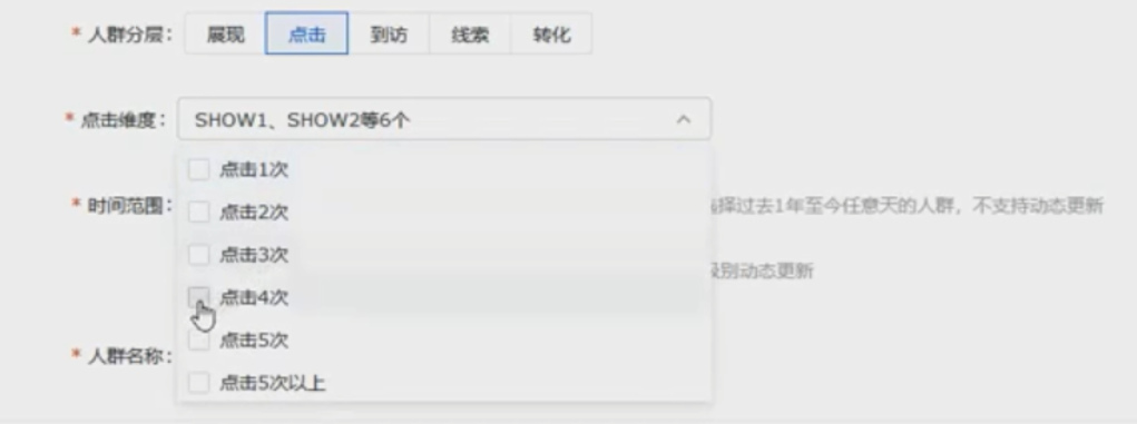 针对多次点击广告,但是不转化的人群,我们可以选择“人群分层”为点击;“点击维度”为“xx次以上”,最后时间范围即可。